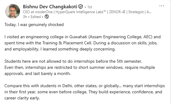 Changkakoti, who recently visited Assam Engineering College in Guwahati and interacted with its Training and Placement Cell, wrote that students are not permitted to take up internships before the fifth semester. Even after that stage, he noted, internships are largely confined to short summer windows, require multiple institutional approvals, and often last no more than a month.